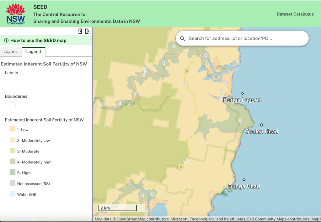 Roughly speaking, the underlying geology determines the parent rock from which topsoil is derived, and this is a major determinant of what the land will allow to grow. Some sense of this can be gleaned from the map below showing the estimated inherent soil fertility in the Bunga area. Without going into detail, with the exception of the moderately high fertility soil at Goalen Head (the so-called “chocolate soil” deriving from the Gabbro rock) and the alluvial soil along the river banks, the soil in the rest of Bunga is classified as only moderate-to-low fertility.